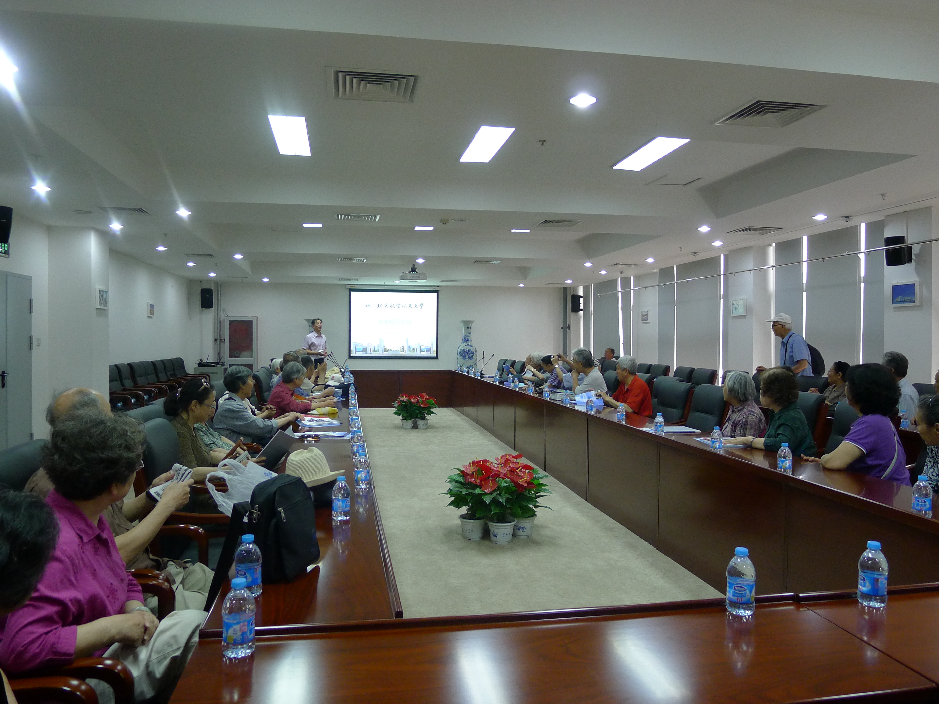 上午十点,沙河校区党委书记陈志英教授首先向各位老教师介绍了沙河校区总体规划和在建情况,并对管理模式进行解读,图文并茂展示了校区文化活动和校园风景。随后,陈志英书记带领老教师们参观了多媒体演示实验室、教室等教学设施,并在新建的北航校歌墙前带领大家高唱“仰望星空”,之后并在校训钟前合影留念。临近中午,虽然天空乌云密布,但一点不影响大家的参观兴致,一边呼吸着新鲜空气,一边感受着浓郁的校园文化氛围。