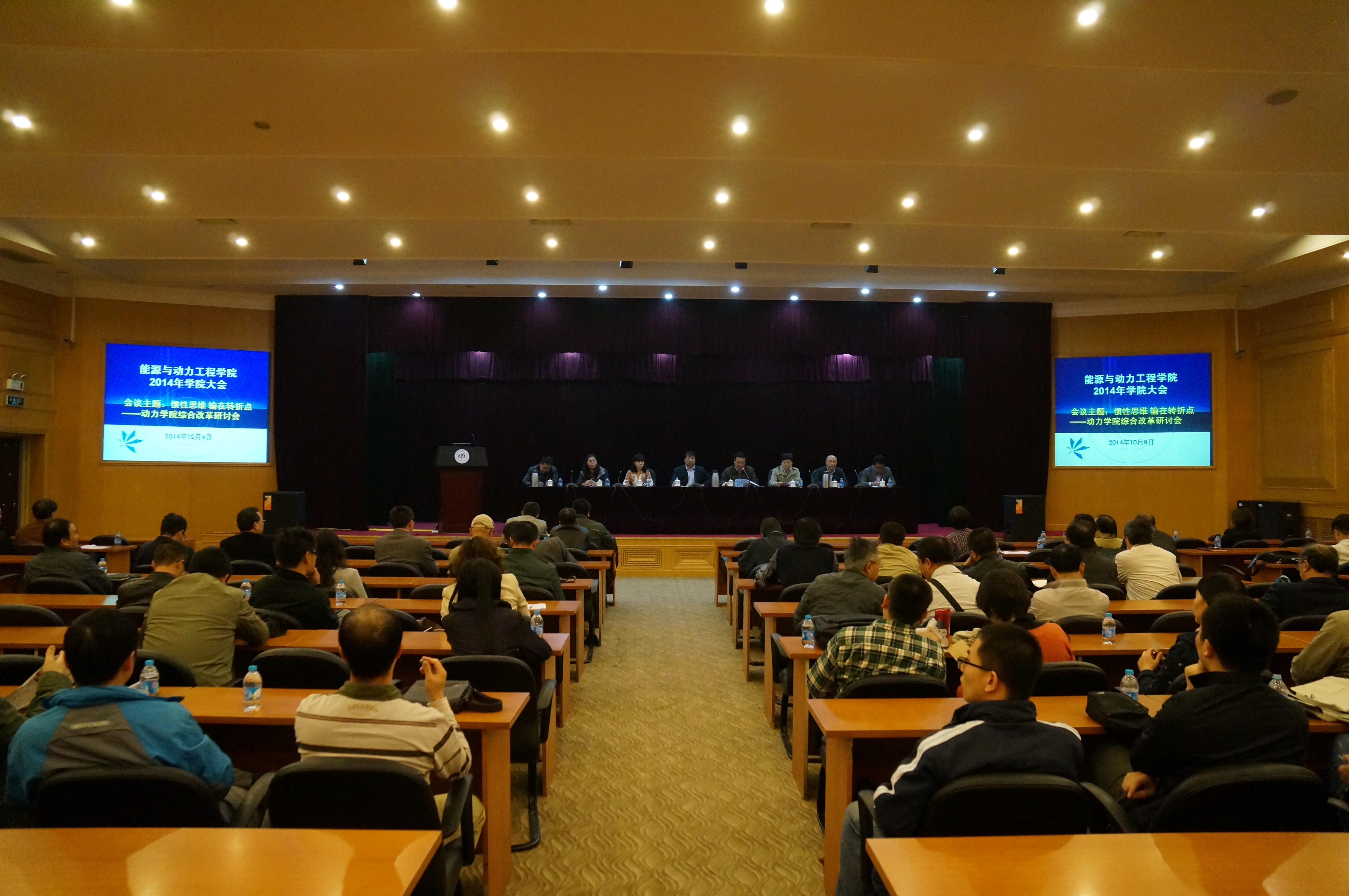 丁水汀院长做了《惯性思维 输在转折点》的大会主题报告。报告首先回顾了2014年9月学校暑期工作会上校长和各位主管副校长的发言要点,向全体教师介绍了学校宏观发展战略和思路、学校近远期资源分配和软硬条件保障的重点、学校增量发展及存量优化的促进举措等。作为学校有着深厚历史积淀的老学院、大学院、金牌学院,我们的目标在哪里?我们需要的人才在哪里?我们的人才培养目标是什么?我们在人才培养上该怎么投入?我们怎样来做高水平研究?我们如何做好个人发展规划?我们怎样实现存量优化、增量发展?通过以上七问的提出,丁院长明确的指出,学院的发展之路就在脚下,学院将坚持三位一体的发展战略,如果横坐标是国际学术前沿,纵坐标是国家重大需求,那么作为全国排名第一的学科,应只做第一象限的研究,绝不做第三象限的事。通过2011平台凝练重大系统和重大工程问题,瞄准国家重大战略需求,资源对接国家实验室,通过大团队科研和研究生培养,力争获得大系统、大工程,出国家发明奖等成果,出一流工程领军人才;通过试点学院、能源与环境国际中心平台瞄准国际学术前沿,凝练重大科学问题,资源对接国际交叉研究院,通过对高等工程教育中国模式探索,鼓励教师进行自由探索研究,力争产生国家自然科学奖等成果,出一流学术领军人才;通过北京航空发动机研究院、通用航空工程中心平台瞄准推动学院科技成果转化,资源对接产业技术研究院,力争通过工程开发研究产生科技进步奖等成果。未来学院的资源(如研究生指标、各类新增资源等)将向这三个方位进行倾斜和投入。