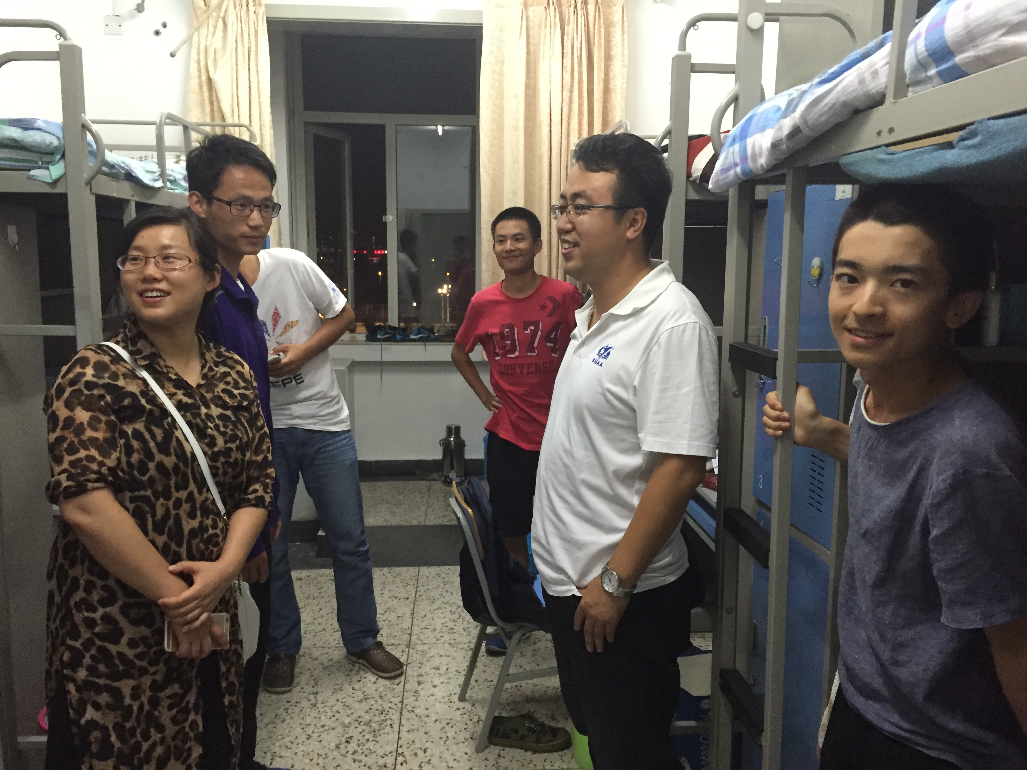 学院党委副书记李建伟老师、分团委书记方志老师等一行来到学生宿舍,在宿舍内与2015级新生亲切交谈,仔细询问同学们目前的生活状态,是否适应大学生活,在生活上和学习上是否遇到困难,衣服床铺是否暖和,是否拿到学院发放的月饼和饮料等。李建伟老师叮嘱同学们天气转冷多加衣服、添厚被,也提醒同学们要经常主动给家里打电话问候交流,让父母放心。当看到有同学在和父母视频聊天时,李建伟老师和学生家长进行了交谈,简要交流了学生情况,请家长放心,同时代表学院对家长致以节日问候。