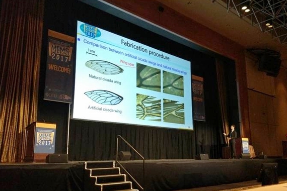 北航新闻网2月27日电(通讯员 赵鑫) 日前,IEEE第30届国际微机电系统会议(MEMS 2017)在美国Las Vegas举行,我校williamhill威廉希尔博士生刘志伟做了题为《Artificial Insect Wings With Biomimetic Morphology And Stiffness》的大会报告(作者:Zhiwei Liu, Xiaojun Yan*, Mingjing Qi, Yi Yang, Xiaoyong Zhang, and Liwei Lin),介绍了我校与加州大学Berkeley分校合作研制的柔性仿生飞行昆虫翅翼的研究进展。该仿生翅翼采用高精度激光切割和多层材料键合工艺加工而成,可以实现与真实昆虫翅翼几乎相同的形貌、质量、弯曲刚度和固有频率等特征,为后续仿生昆虫的自主飞行奠定了重要基础。