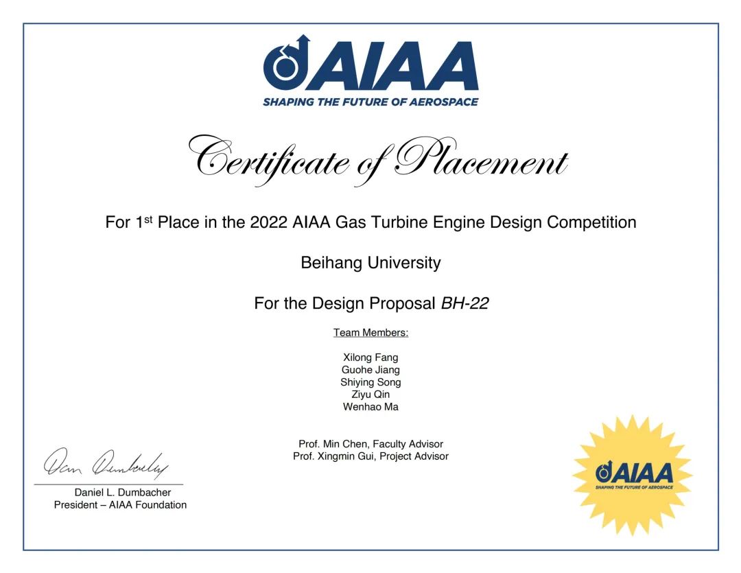 来自GE、罗罗、NASA等公司和机构的学者组成的AIAA组织委员会充分肯定了北航学生提交的《针对“协和号”超音速客机的引擎设计方案——BH-22》的合理性和先进性,在众多参赛团队的设计方案中确定其为第一名,并做出高度评价。