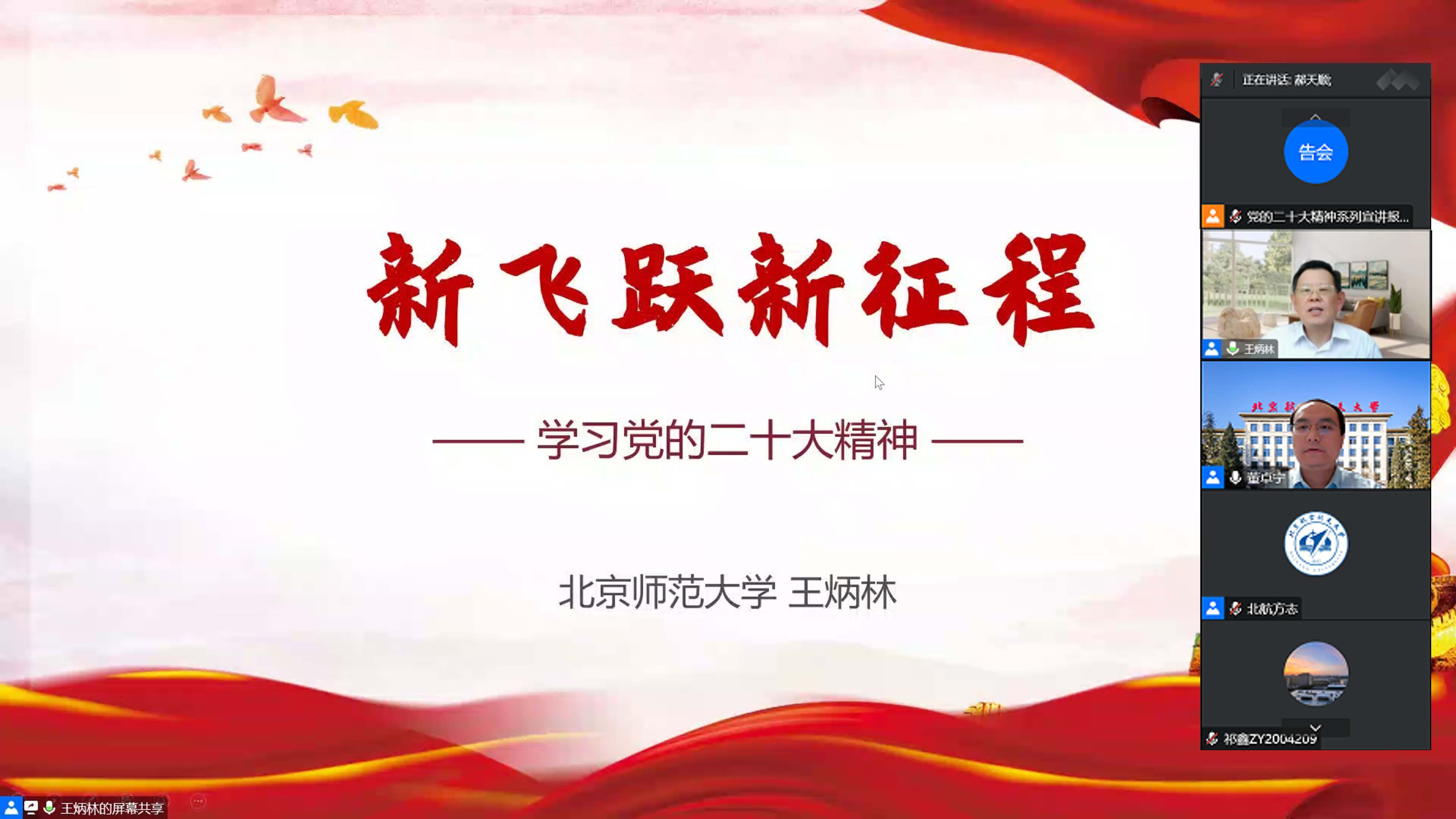 为深入学习宣传贯彻党的二十大精神,落实学校党委工作部署,把全院师生的思想统一到党的二十大精神上来,把力量凝聚到党的二十大确定的各项任务上来,williamhill威廉希尔党委开展党的二十大精神系列宣讲报告会。12月7日下午14:30,williamhill威廉希尔党委邀请北京师范大学中共党史党建研究院院长王炳林教授作第三场报告,报告主题是“新飞跃新征程——学习党的二十大精神”,带领师生深入学习党的二十大精神,把握二十大报告的主要内容,在新的征程上,踔厉奋发,勇毅前行。williamhill威廉希尔班子成员,以及全院师生党员等参加报告会。报告会由williamhill威廉希尔党委书记董卓宁主持。